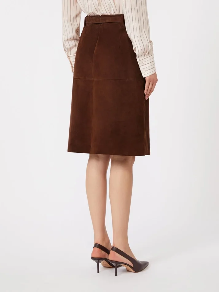 leather skirt style in lamb leather; lining in 97% polyester, 3% elastane; with belt in lamb leather.