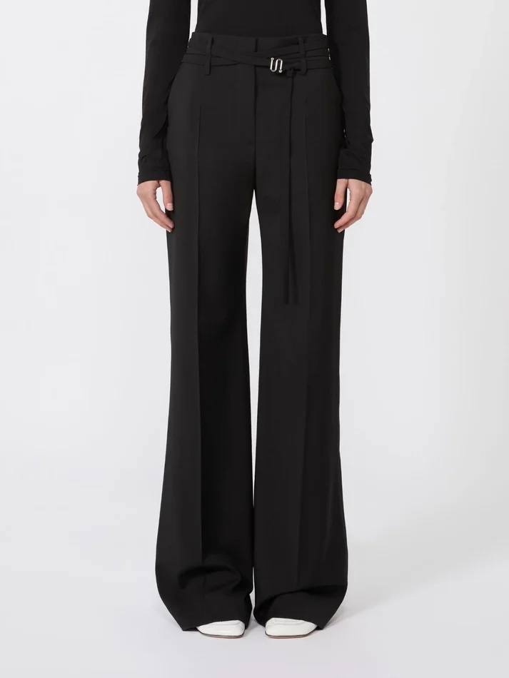 low-rise flared trousers with tailored construction and customised internal waistband. the style features a double-wrap belt at the waist and a metal s-buckle, an iconic element of the collection.