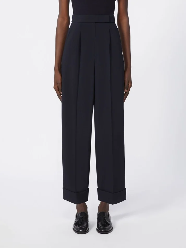 high-waisted trousers with turned-up hem, cropped above the ankle.