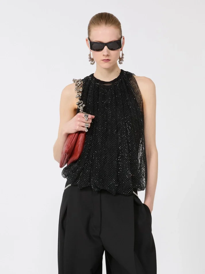 dedicated to glamorous occasions, this mesh top features a sleeveless line and matching crystals applied all over. the elastic insert at the garment’s hem creates a bubble effect.