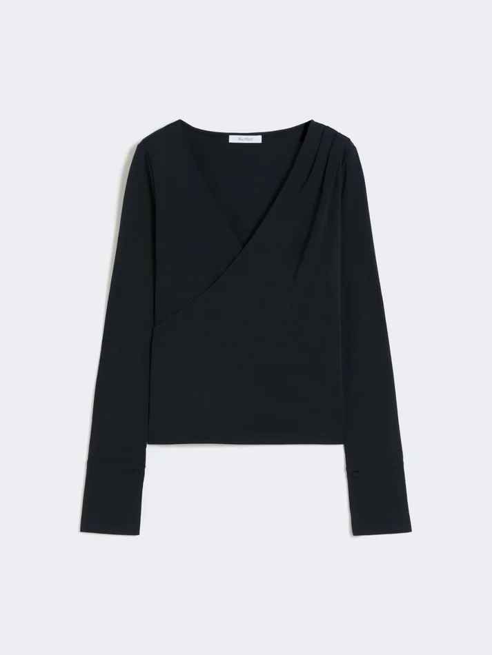 long-sleeved top, featuring a pleated pattern on the side that adds movement and volume to the garment.