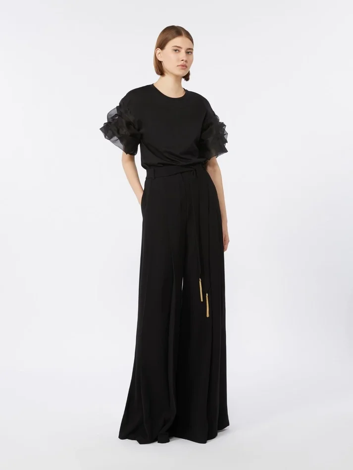 palazzo trousers featuring half-sewn pleat detail on the front which both bestows volume and creates a culotte effect.