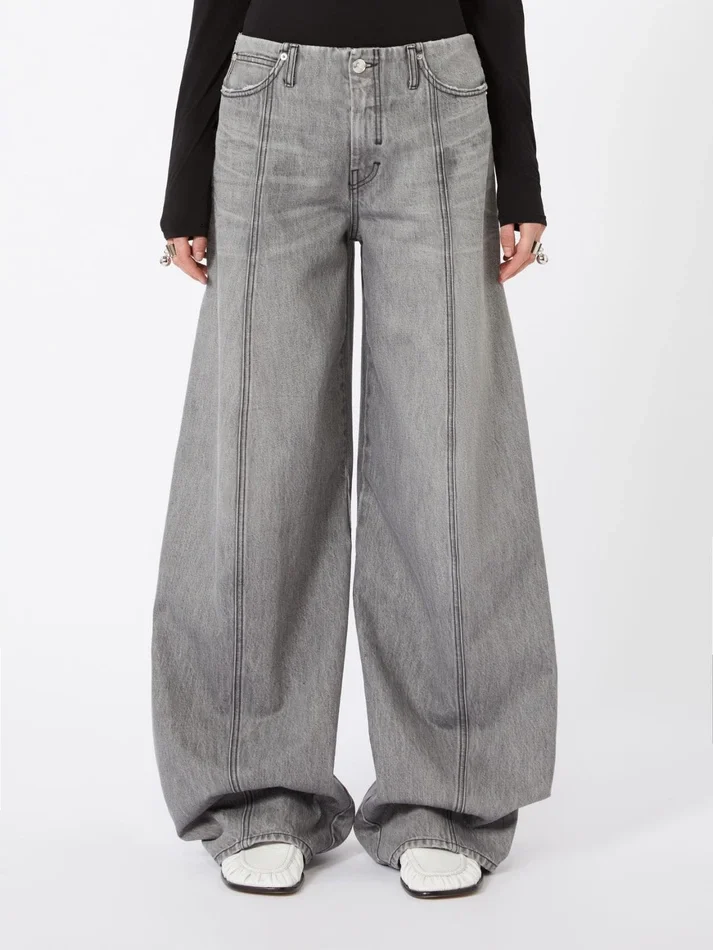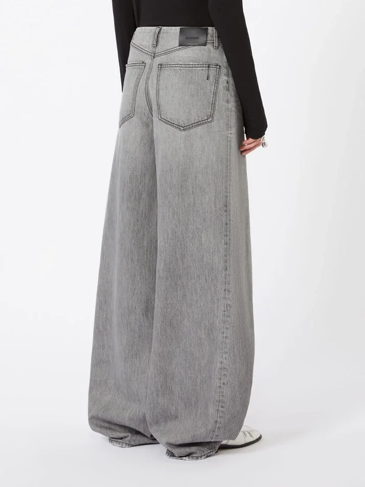 oversized trousers made of black denim, with wide leg and rounded knee shaped by vertical seams and stitching. the design features six pockets, accented with contrasting stitching and the iconic logo label on the back.