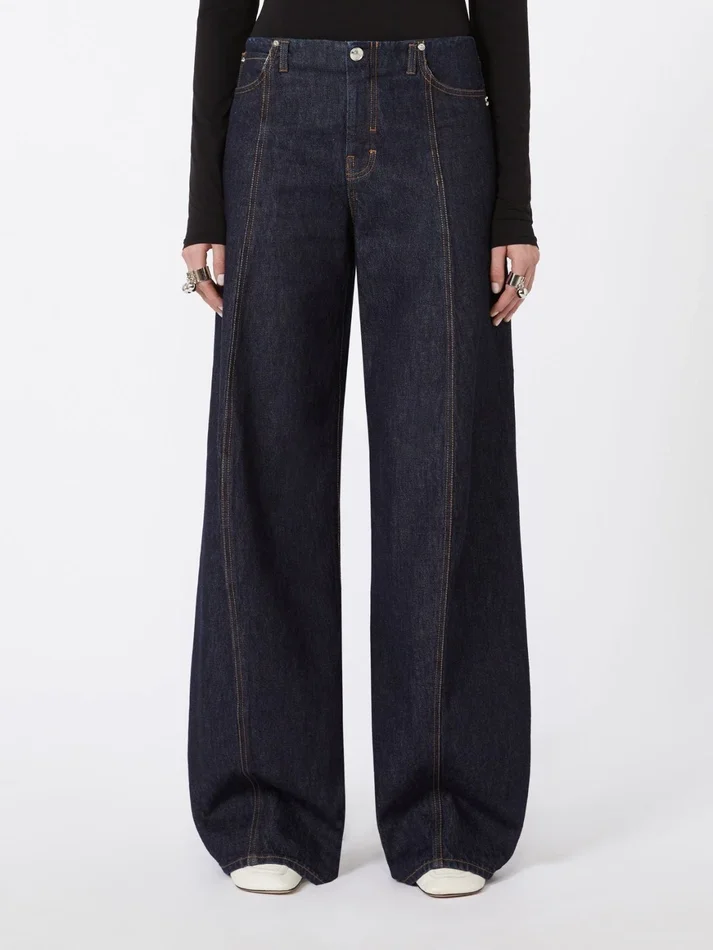 new five-pocket jeans with an innovative shape, with a rounded line at the knee and loose fit. the construction without a waistband emphasises the clean look of the trousers..