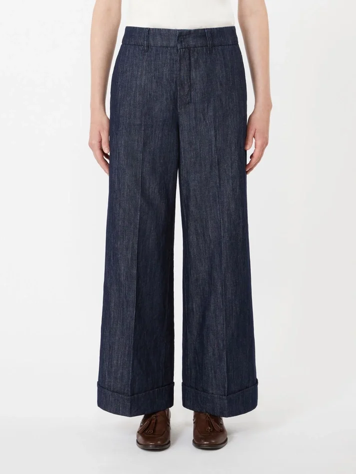 straight-leg trousers featuring deep turned-up leg hems and pressed pleat detail.