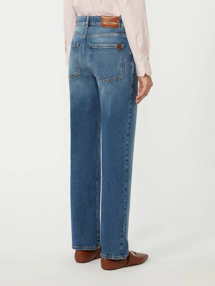 five-pocket straight-leg jeans, customised with a logo label on the waist back.
