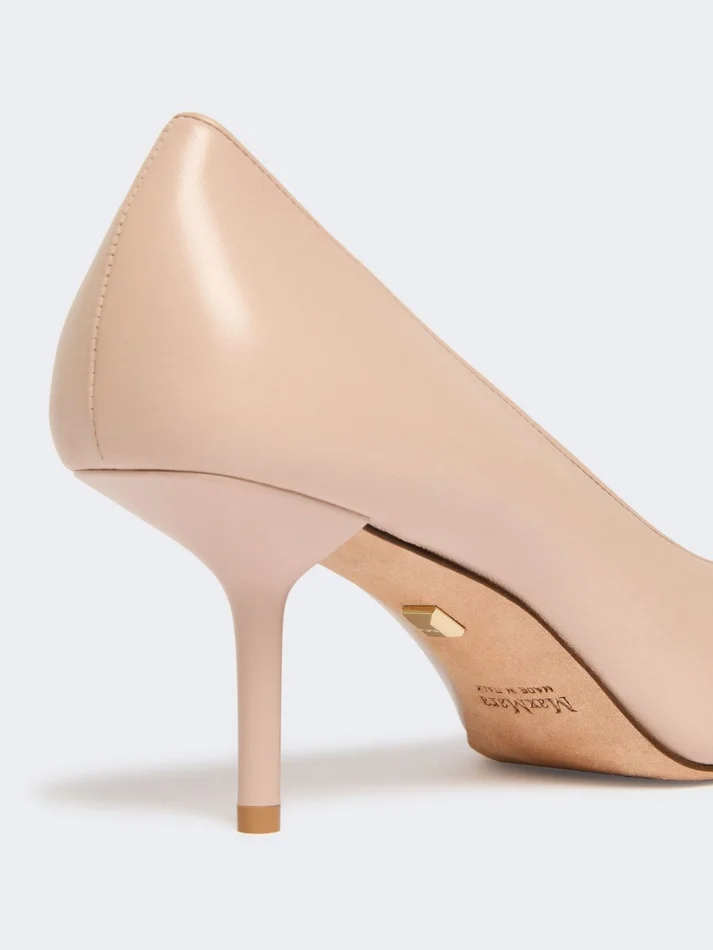 pointy-toe court shoes with oval top line, square back and straight stiletto heel lacquered in a matching tone.